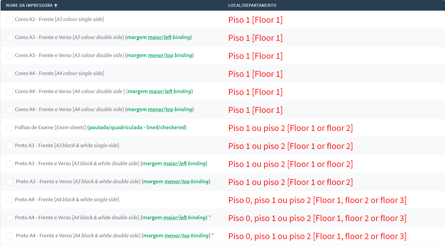 Podes consultar na secção “Impressoras” em qual das impressoras multifunções podes levantar o teu documento, além disso, na plataforma sempre podes verificar na lista dos tipos de impressão, onde o teu documento estará disponível.
